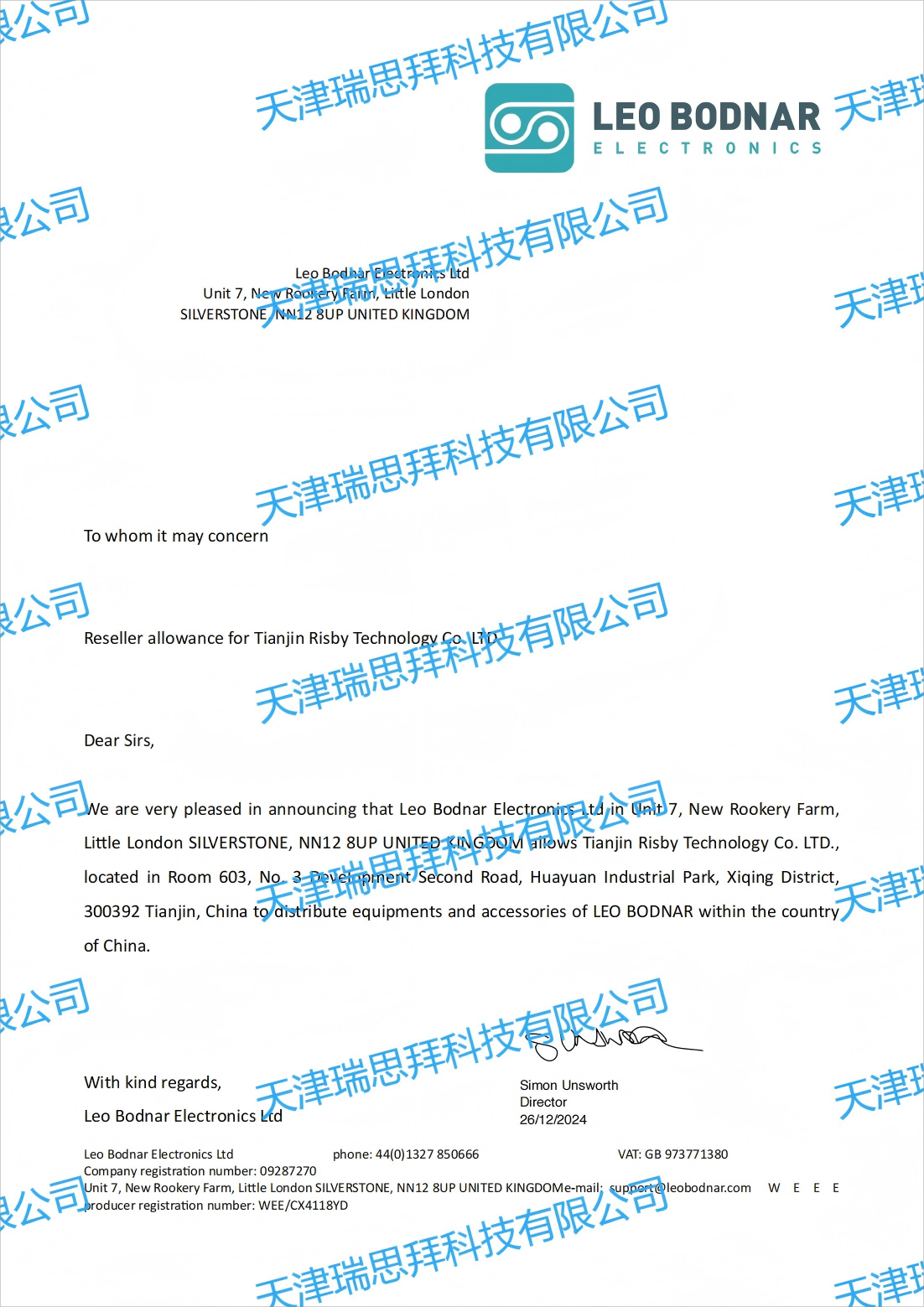 天津瑞思拜科技有限公司作為Leo Bodnar中國區(qū)代理商,對Leo Bodnar的所有產(chǎn)品有銷售權(quán),歡迎合作。
